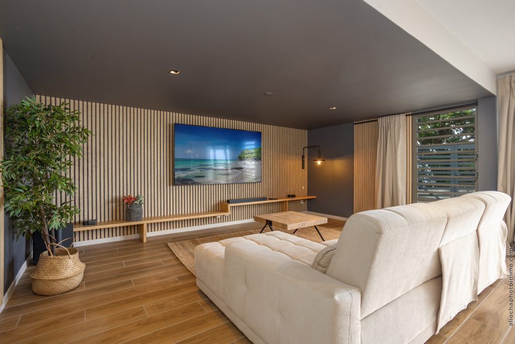 Salon TV indépendant et salle home cinéma pour des soirées en toute convivialité